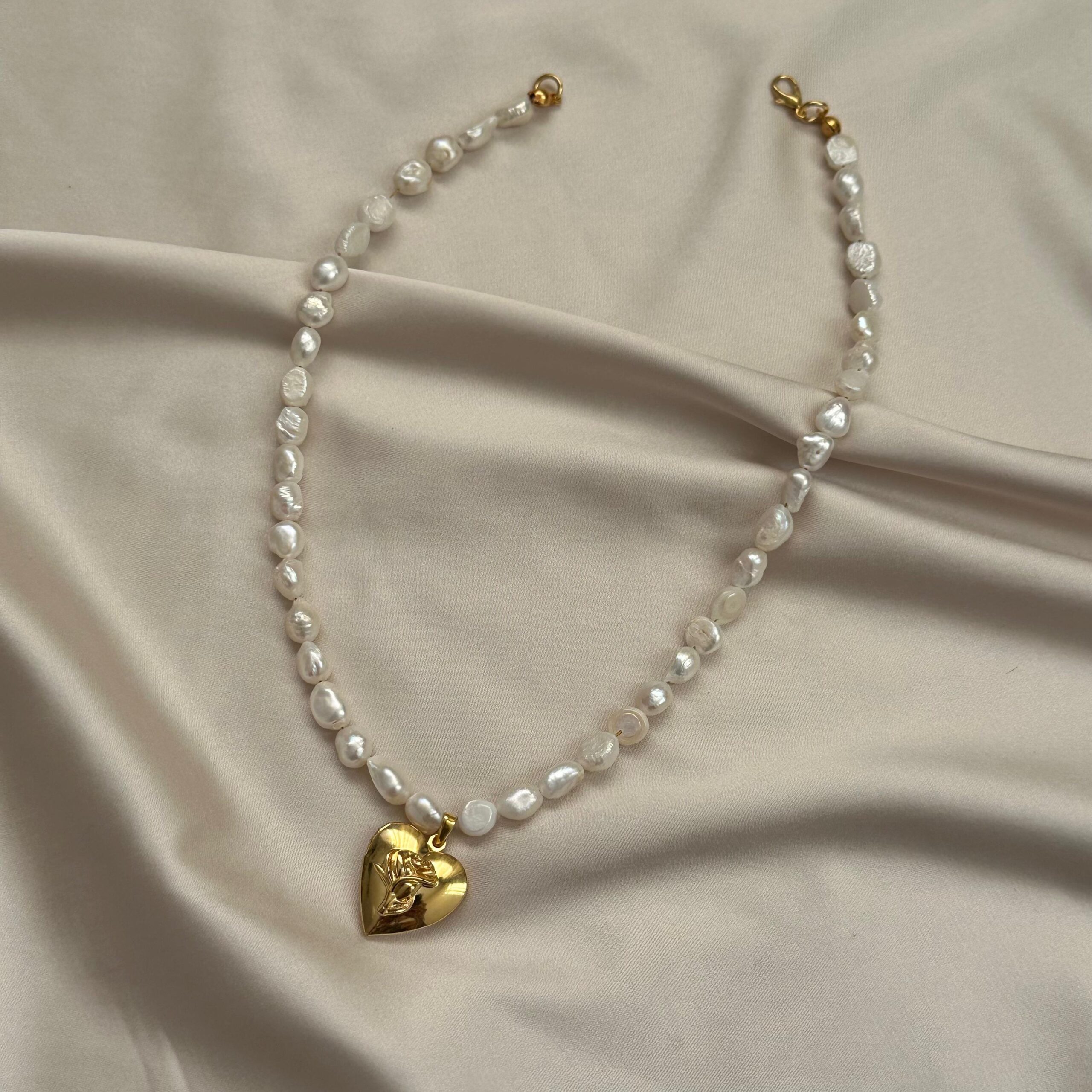 Gerçek inci, 14K altın kaplama charm ve çelik misina kullanılmıştır.